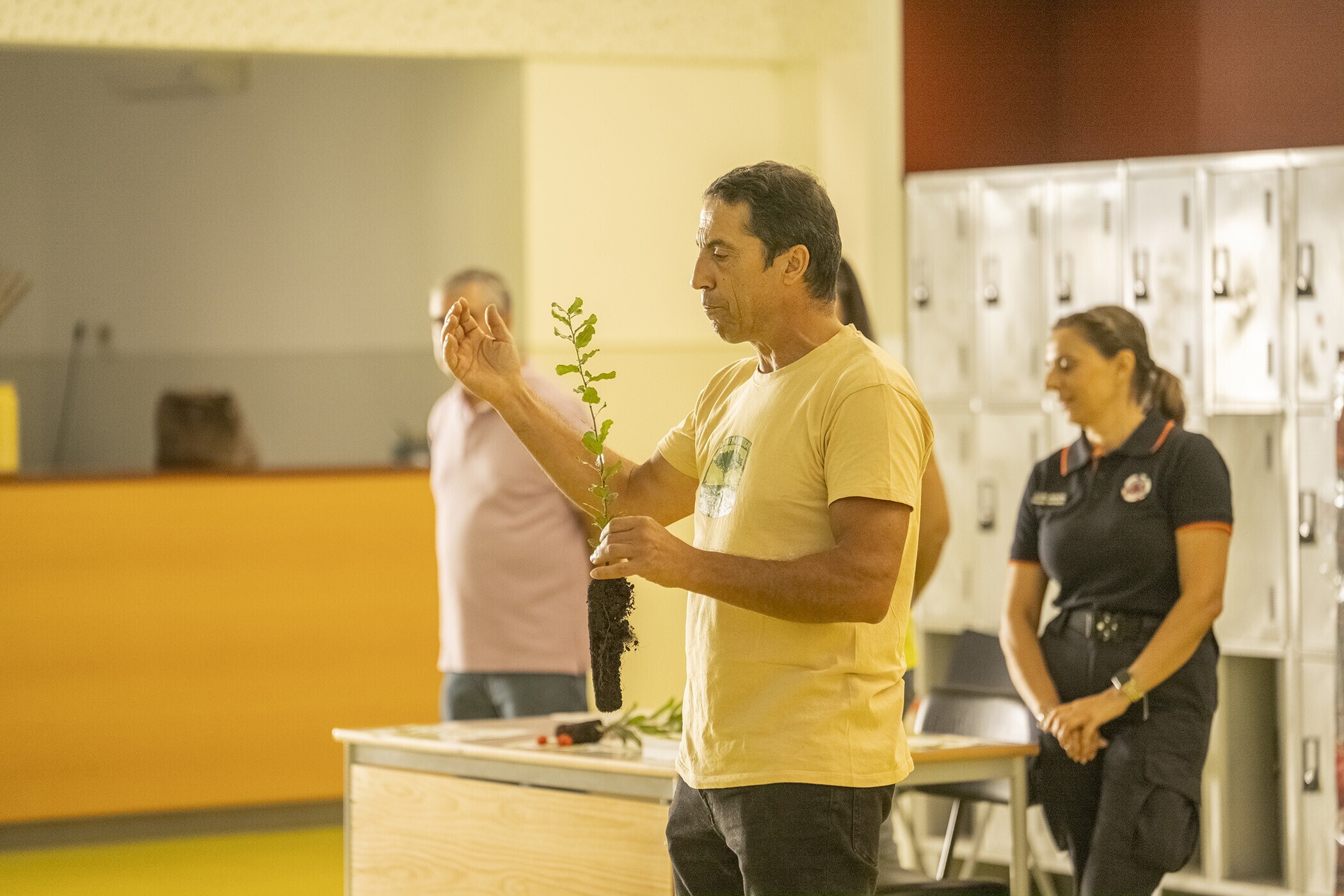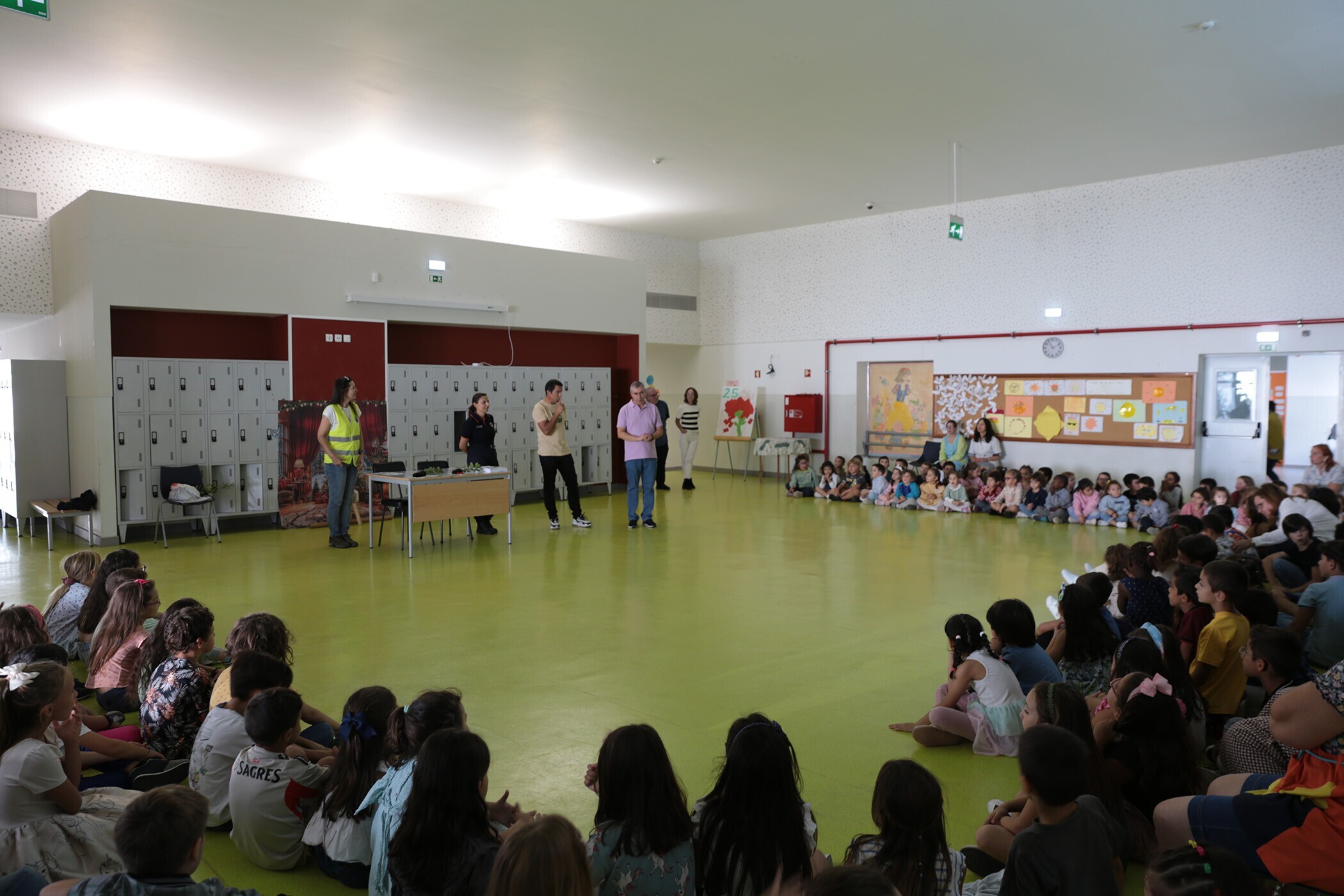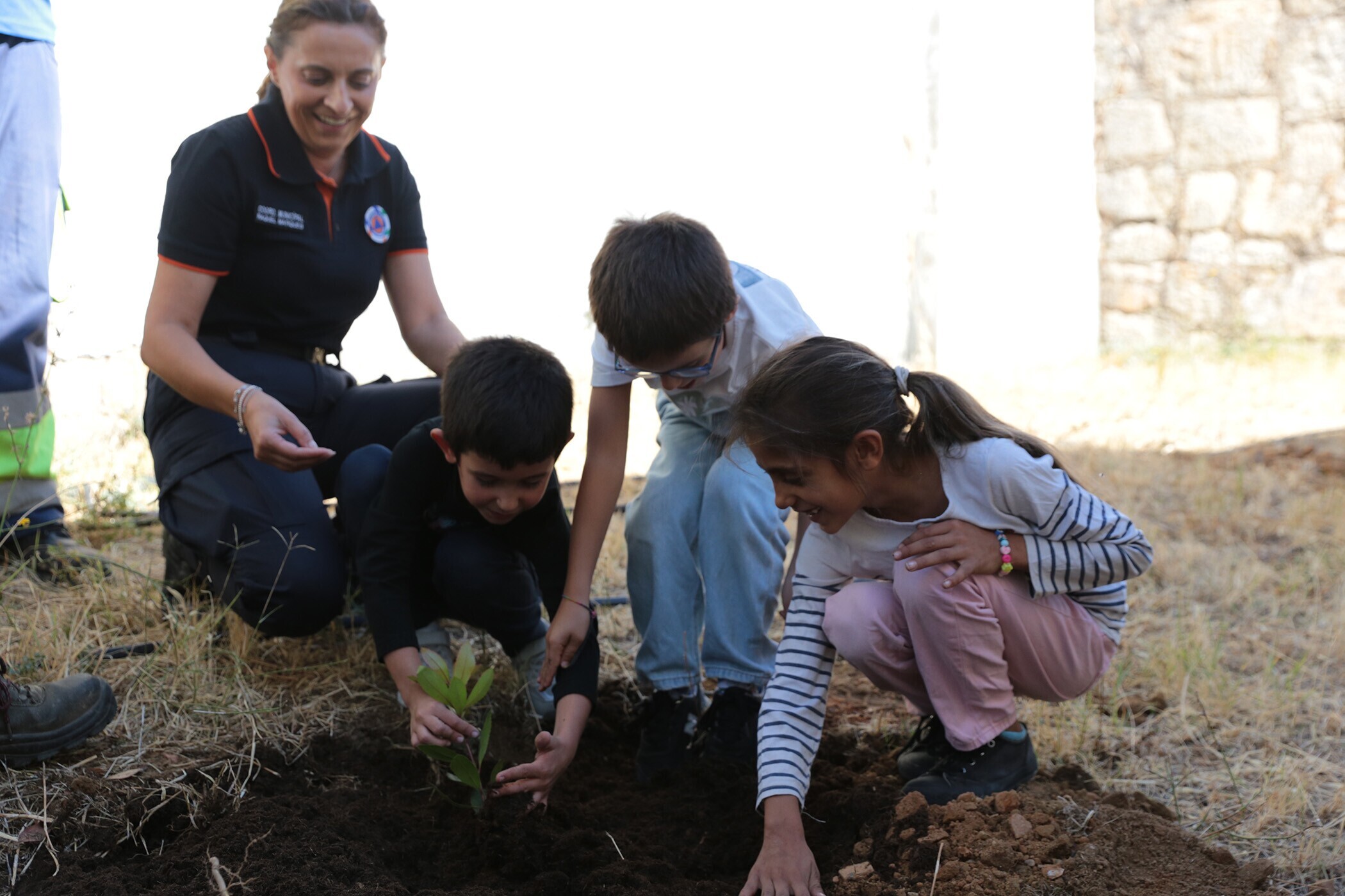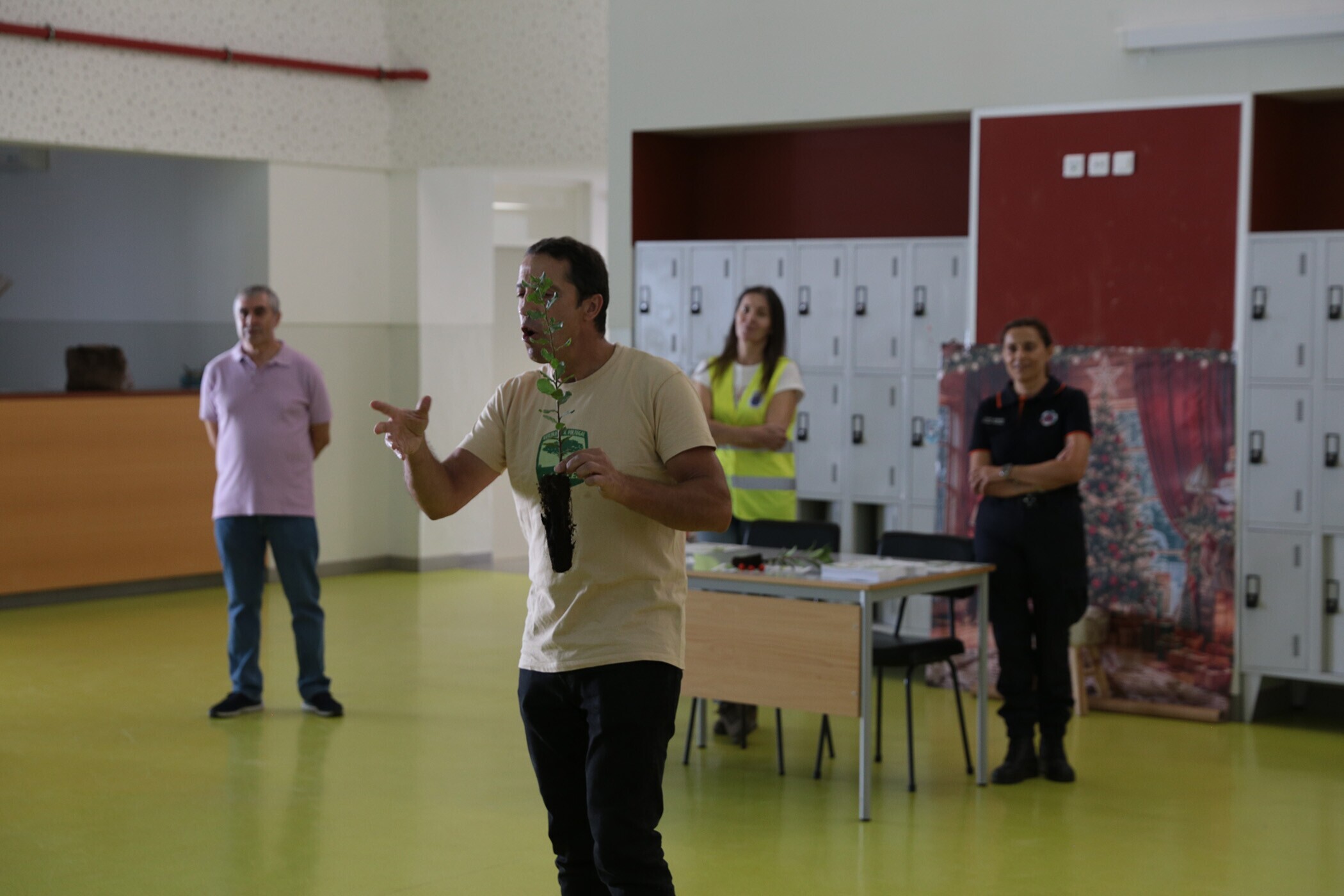 As crianças ouviram atentamente as explicações sobre as vantagens de optar pelas árvores locais no processo de reflorestação, antes de plantarem três medronheiros e dois sobreiros no pátio da escola.