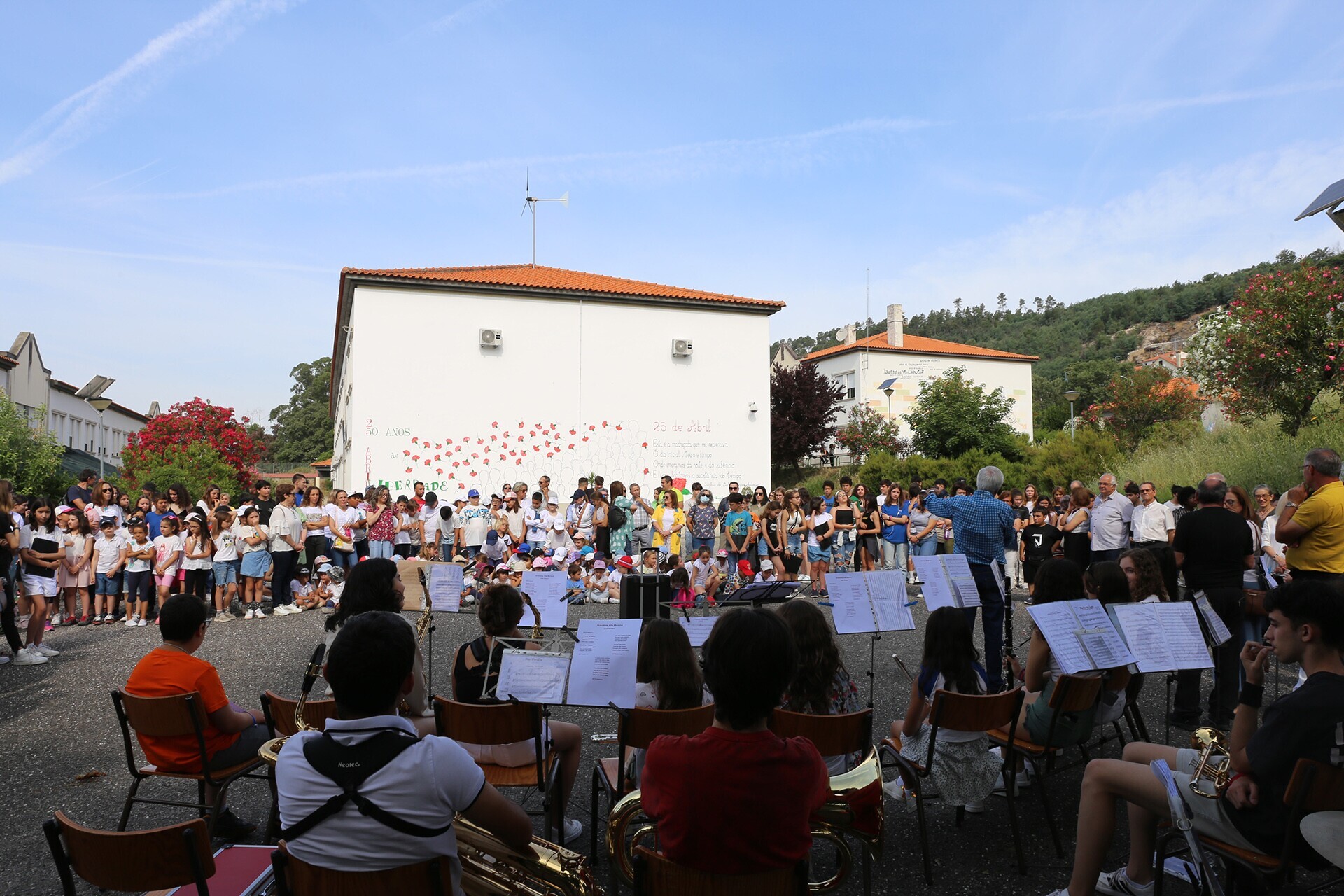 Foi inaugurado um Mural Comemorativo dos 50 anos do 25 de Abril no Bloco B da Sede do Agrupamento de Escolas Ribeiro Sanches (AERS). A iniciativa decorreu durante a cerimónia de encerramento do presente ano letivo e está integrada no programa anual das comemorações dos 50 anos da Revolução dos Cravos no concelho. Presente na cerimónia, a Vice-Presidente da Câmara Municipal de Penamacor felicitou a comunidade escolar por mais um ano letivo, dando os parabéns a professores e alunos pela obra agora inaugurada. “Esta iniciativa insere-se nas comemorações que assinalam meio século do 25 de Abril e estão de parabéns alunos e professores por este mural. Desejo-vos bons resultados este ano, que tenham umas boas férias e que regressem no próximo ano cheios de força e com vontade de brincar, mas também de trabalhar e de estudar”. O dia contou, ainda, com as atuações da Banda Filarmónica de Aldeia de João Pires e da Academia de Música e Dança do Fundão, com uma coreografia dos alunos do Ensino Básico do Agrupamento, com a representação da peça “Silêncio” pelo Grupo de teatro do AERS “Quebra_Gelo”, com torneios de ténis de mesa, badmington e basquetebol e com exposições. Finalmente, foram, ainda, entregues os prémios do “Concurso de Leitura Expressiva” aos alunos dos 2º, 3º e 9º ano. O programa anual das comemorações dos 50 anos da Revolução dos Cravos pode ser consultado no portal do Município de Penamacor, em www.cm-penamacor.pt/p/50anos25abril